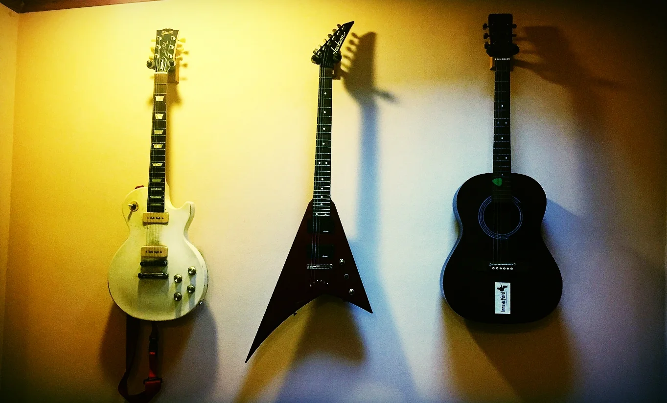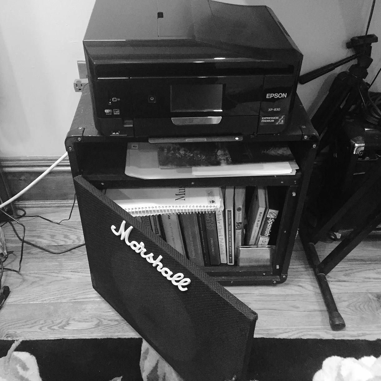 Martin is a handy creative guy and took my suggestion further than I ever imagined. When I came back for our next session Martin had taken it upon himself to actually transform this amp into a true printer table. When I had suggested using the Marshall for his printer I just meant sit the printer on top. I thought it looked cool in his space, got the printer off the floor and created space by stacking the two. I was so excited to see what he had done. He actually took all of the guts out of the amp, created a hinged door and space for his work books, manuals and printer paper. This is what I'm talking about, people!!! We also decided it would be wise to hang Martin's guitars in his office. Before they were resting against his desk, sitting on his office chair, couch, bed or on the floor. Now they are safely hanging in his office with a Designated Home and they add to the look and feel of his office.