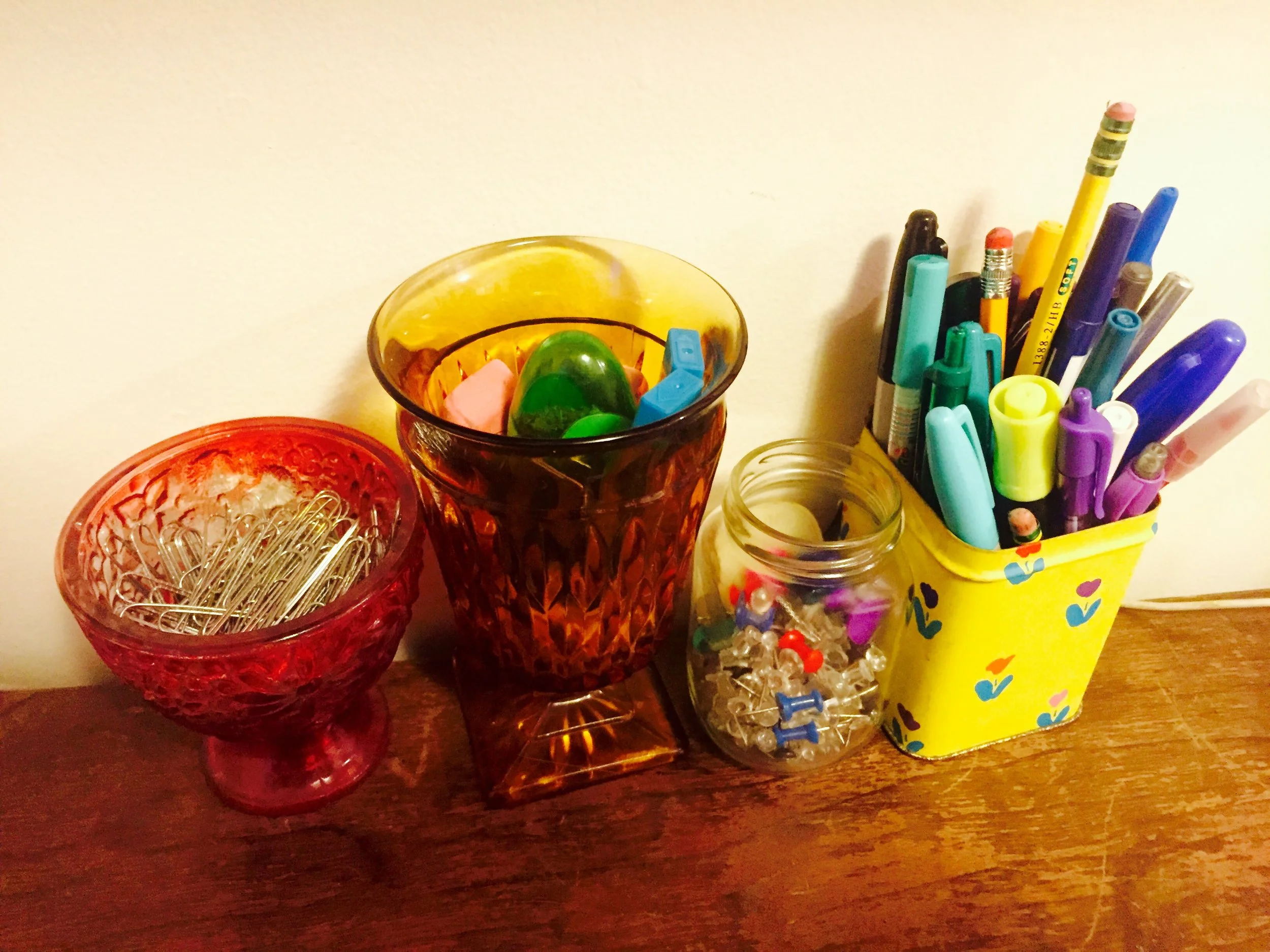 Having lived in a city my entire adult life I have always needed to be very aware of how much space I am working with. I recently used this technique to change things up on my desk. I transferred my office supplies from the little tupperware containers they were in to things I really enjoy. Now my paper clips, rubber bands, thumb tacks ect. are in fun glass vessels that I already owned and are making the top of my desk add to the aesthetic of my office. It also freed up space in the drawer I was keeping them in. Now my office is a tad cuter and everything I've used matches my personality and style, not that of Tupperware Brands Corporation.
